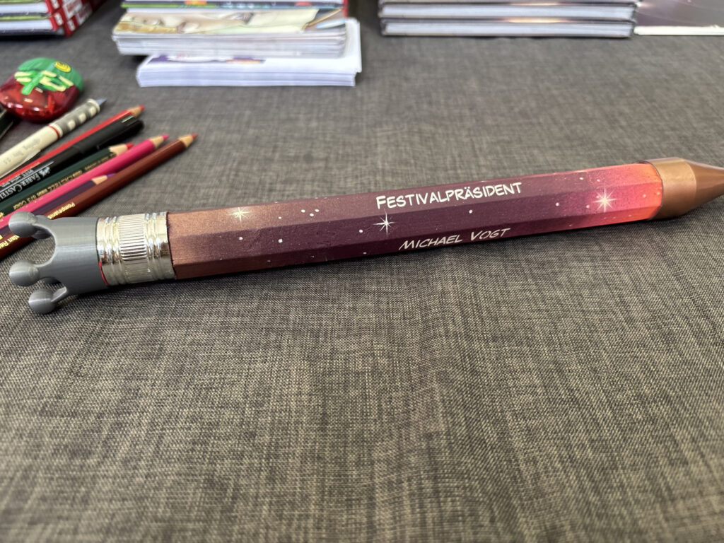 Ja, als Ehrenpräsident erhält man tatsächlich ein Zepter – in Form eines riesigen Bleistifts mit dem man auch tatsächlich zeichnen kann.