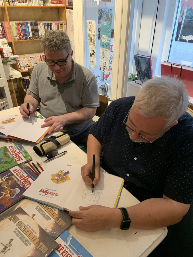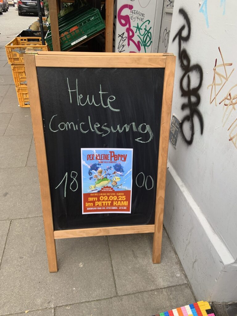 Vorpremiere feierten wir im Berliner Comicladen „Grober Unfug“ in Kreuzberg mit einer kleinen Signiersession – wie immer auf einer Bierbank vor dem Laden. Die „richtige“ Buchpremiere fand dann allerdings am 9. September in Hamburg statt, hier natürlich wieder mit Olaf! Wir fanden uns zu einer Lesung und einer Signierstunde im Bahrenfelder Comicladen „Petit Kami“ ein. Zu der Veranstaltung kamen sogar weitangereiste Fans (und natürlich einige große und kleine Hamburger).