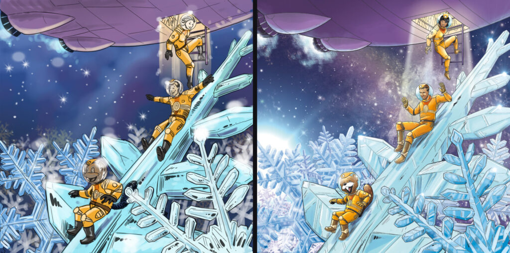 Noch vor den Cartoons durfte ich zum ersten Mal eine PERRY-Weihnachtskarte gestalten, die von der Redaktion zur passenden Zeit an Mitarbeiter verschickt wird. Hierfür musste ich realistischer zeichnen, trotzdem habe ich immer eher humorige Motive geschaffen. Insgesamt habe ich bisher zehn Illustrationen zu diesem festlichen Anlass in der weit entfernten PERRY-Zukunft gezeichnet.