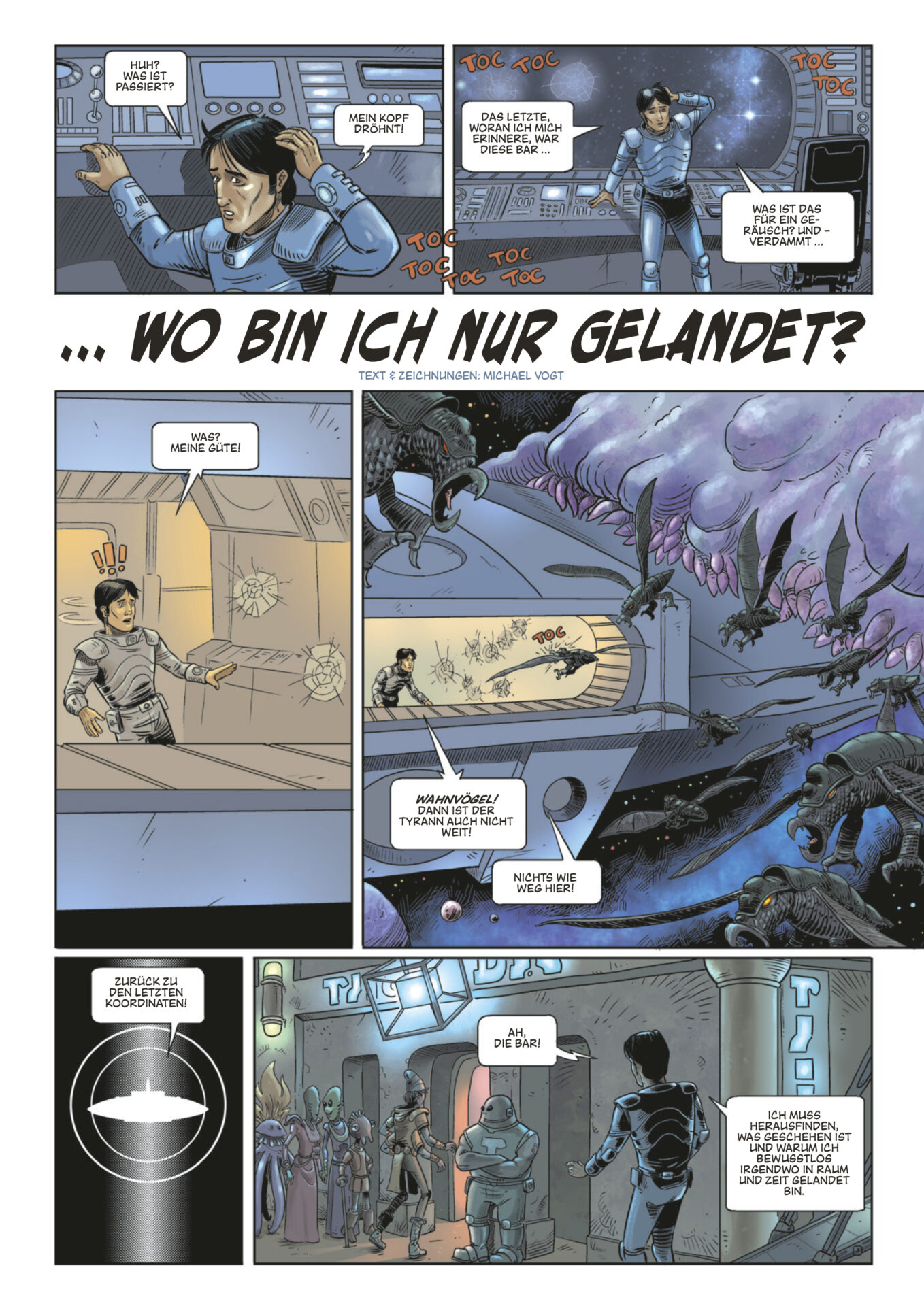 Seite aus dem vierseitigen Comic „Wo bin ich nur gelandet?“ für den Band „Hommage an Valerian & Veronique“, erschienen 2023 im Carlsen-Verlag.